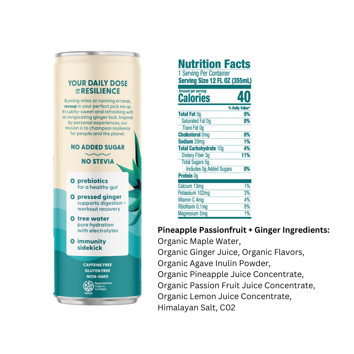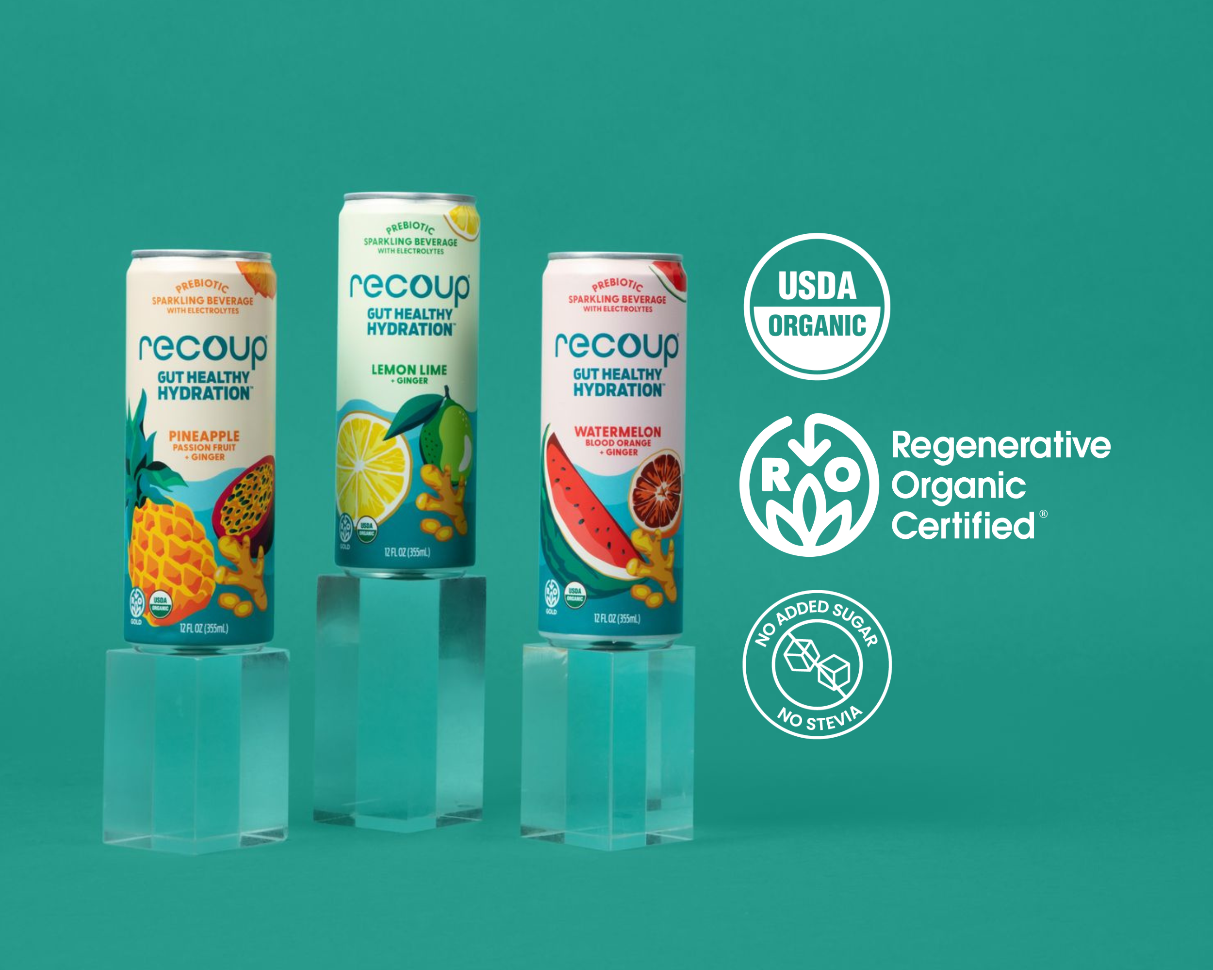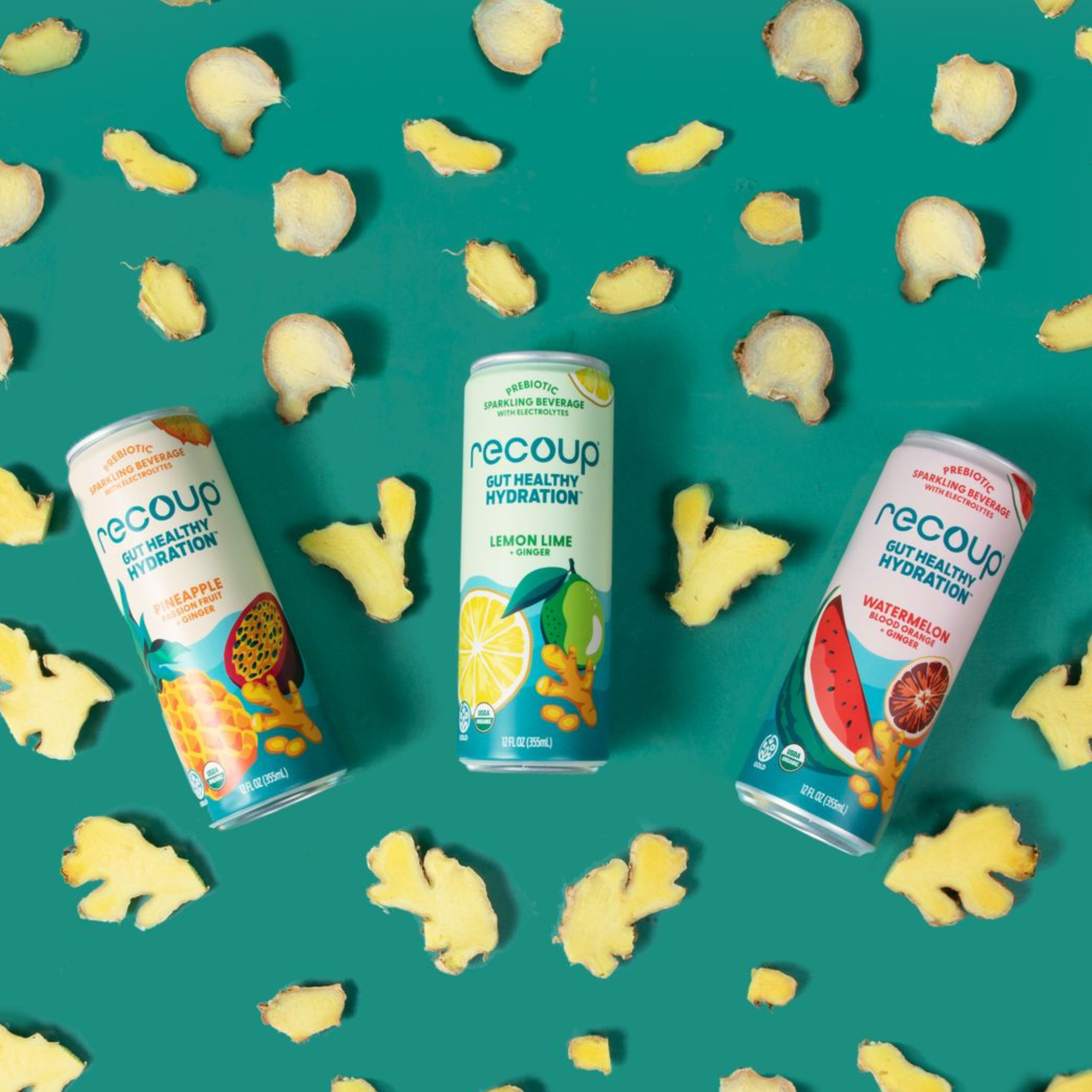 Recoup sparkling prebiotic drinks keep your gut happy and healthy with 3 grams of prebiotic fiber and a dose of real ginger. They are a delicious, hydrating alternative to the kombuchas, tonics, and sodas in the gut health space. With key electrolytes magnesium and potassium, zero caffeine, and no added sugar and these deliver “gut healthy hydration” and recovery for the sport of life.